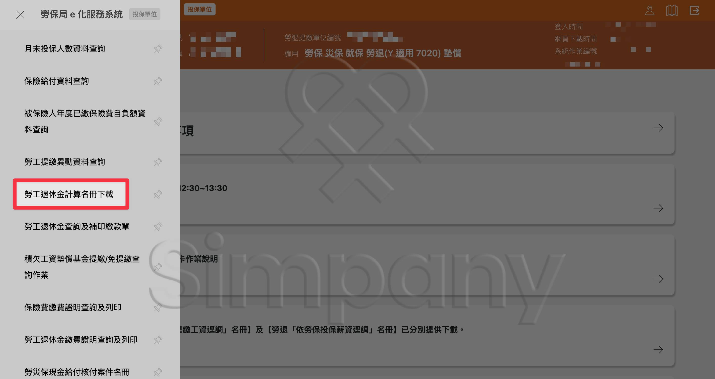 - 點選左上所有功能選單 → 「資料查詢作業」 → 「勞工退休金計算名冊下載」