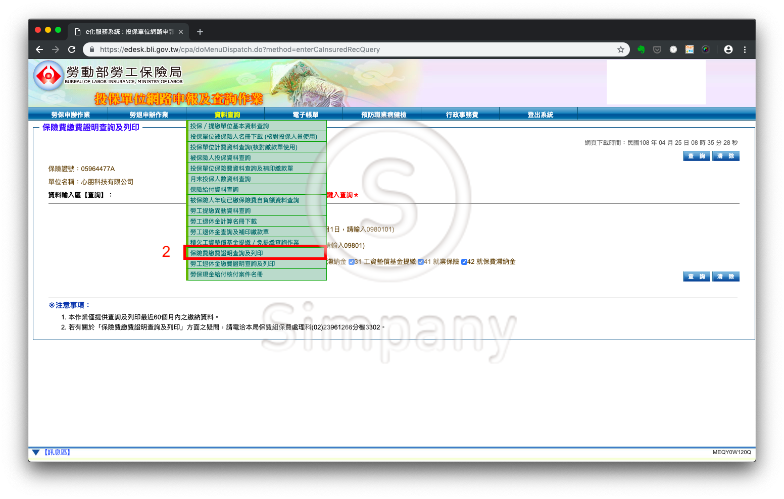 選擇「資料查詢」->「保險費繳費證明查詢及列印」