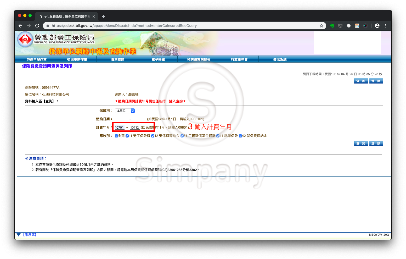 勞退繳費證明 – 輸入計費年月(如果公司沒有員工自提勞退,可取消勾選「個人提繳退休金」) -
