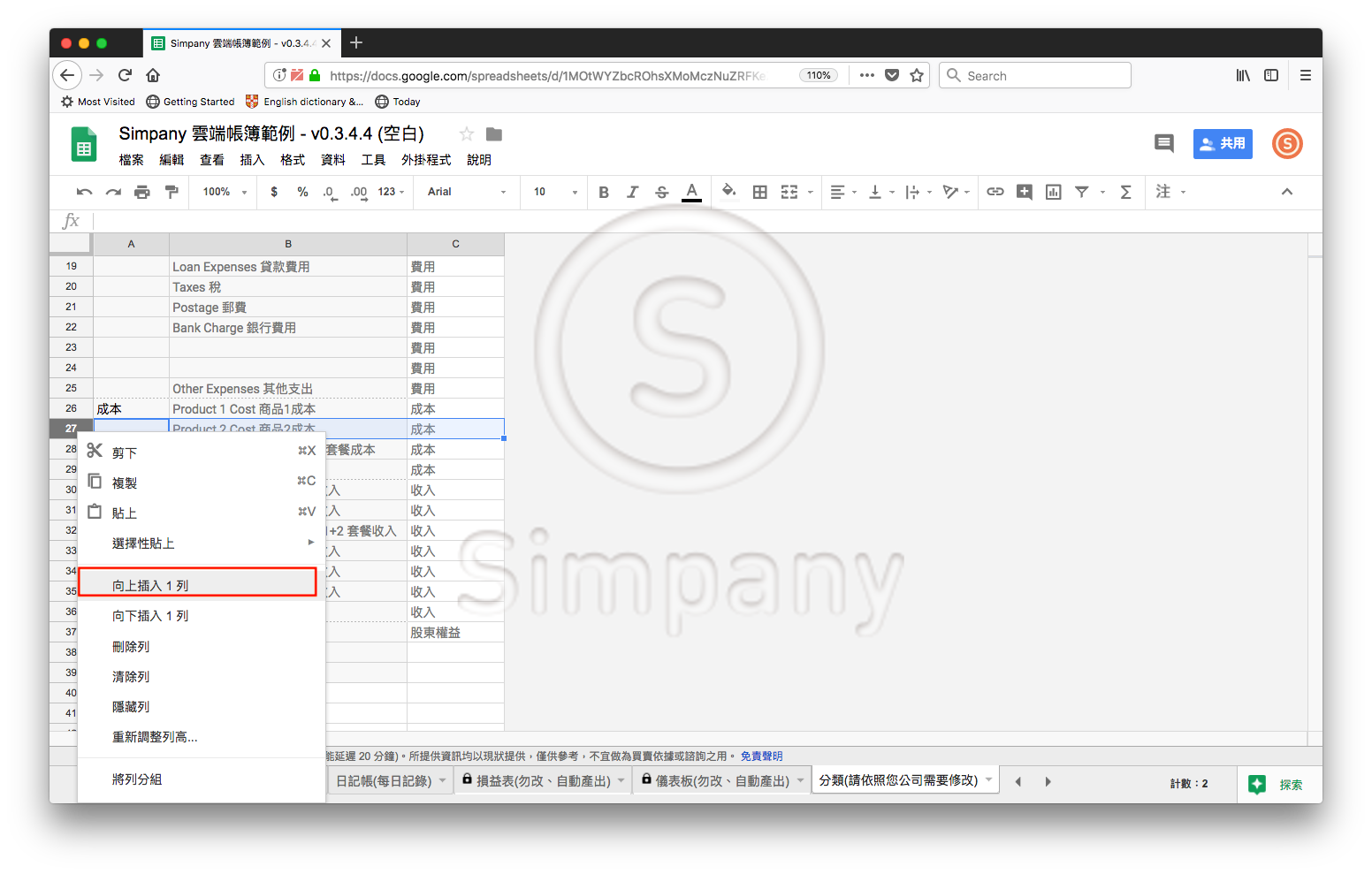 如果要增加多一點「收入」、「成本」、「費用」的欄位,可以直接插入一行,並且記得在 「C 欄」打上相對應的屬性(「收入」or「成本」or「費用」)