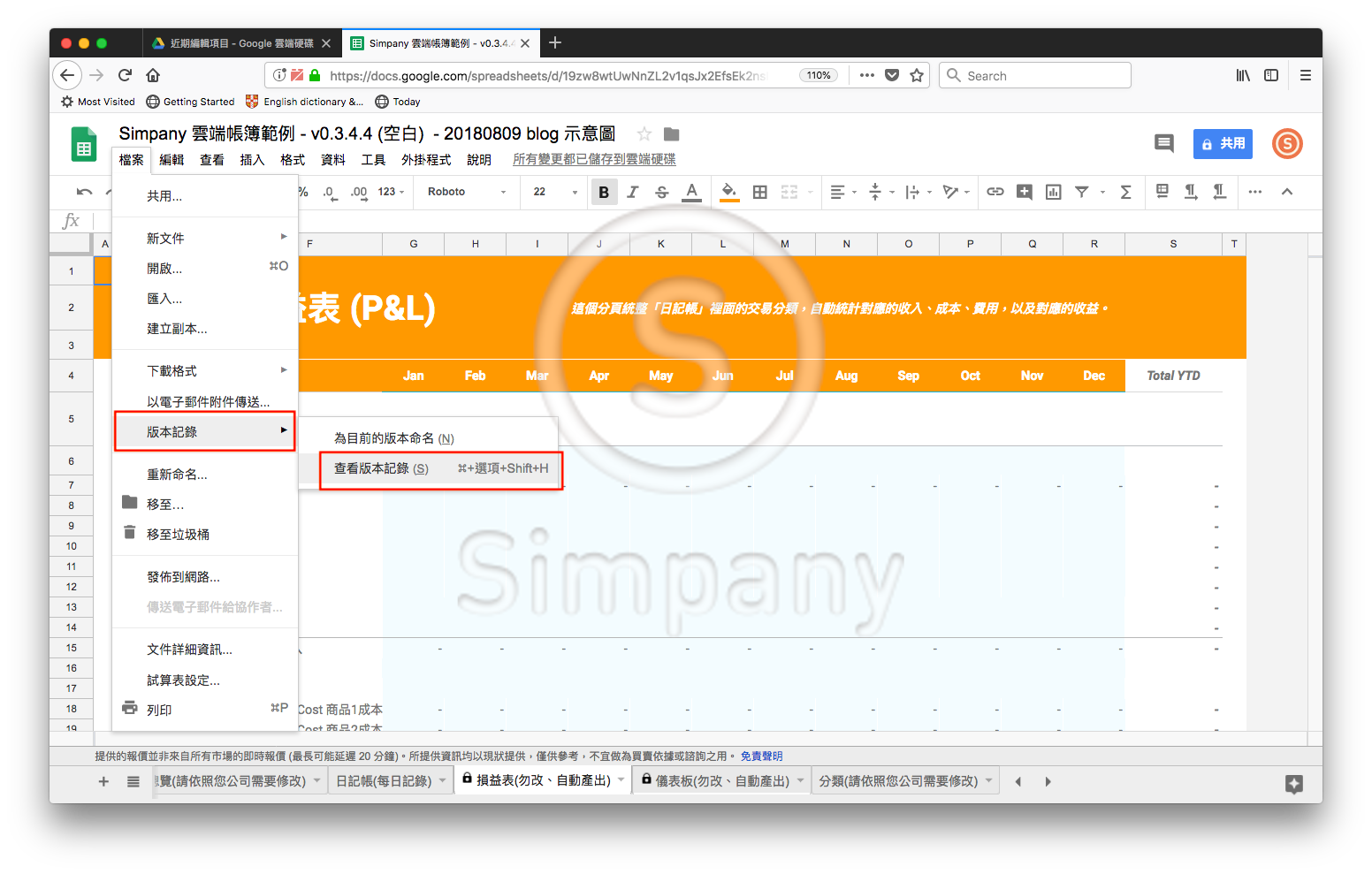 或是您也可以使用「檔案」->「版本記錄」->「查看版本記錄」